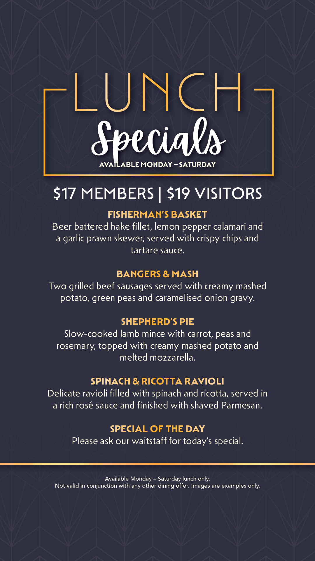 Available Monday to Saturday lunch only. Not valid on Public Holidays or Special Event Days. Not valid in conjunction with any other dining offer.